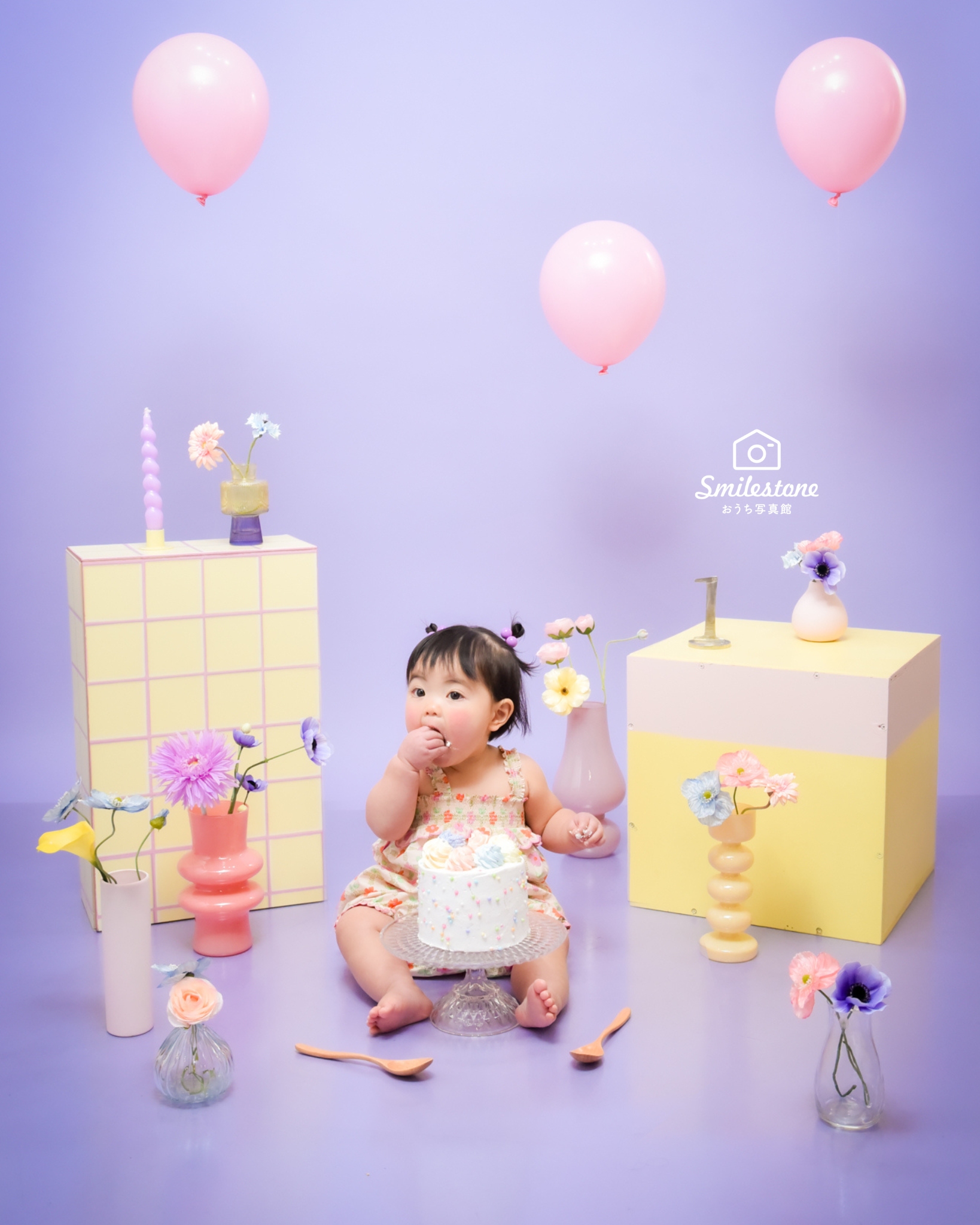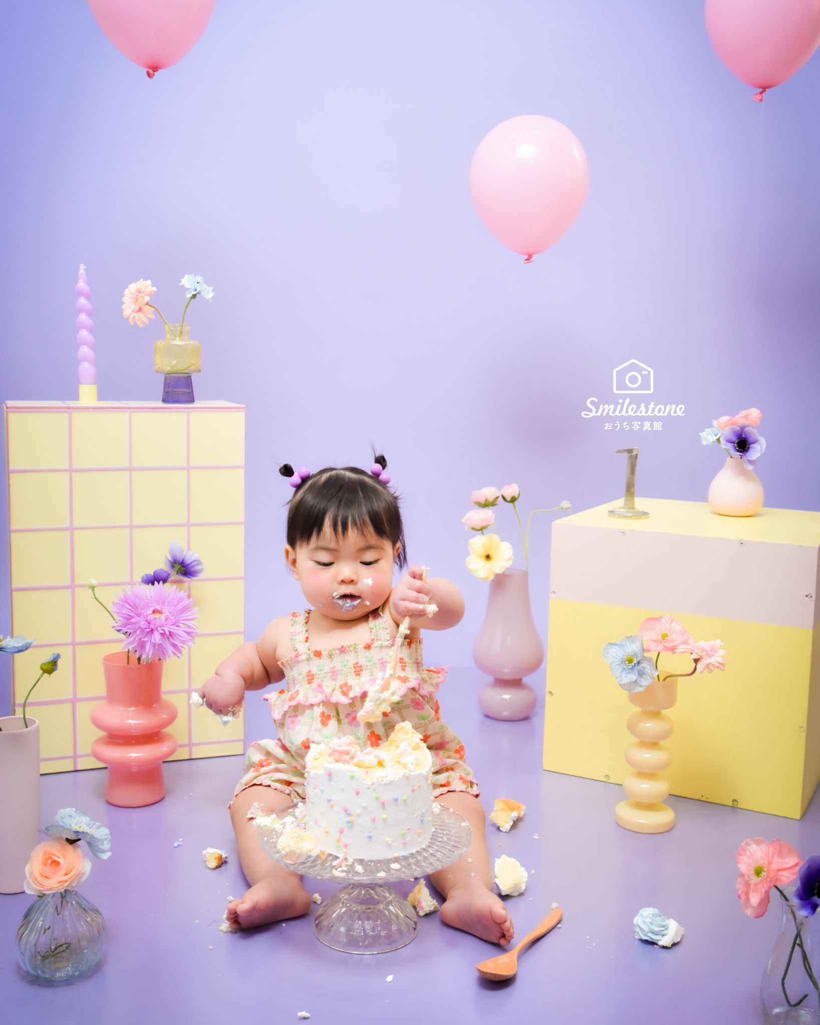 壊しながら食べるケーキのこと。赤ちゃんがケーキを手づかみして壊しながら食べる可愛い姿を写真に残すのが、海外ではすでに大人気!主に1歳のお誕生日のお祝いとして行われています。おうち写真館のナンバーワン人気プラン!スマッシュケーキフォト。撮影当日は、まずは通常のバースデイ撮影からスタートしウォーミングアップ。ご家族フォトも撮影します。そして撮影に慣れてきた頃にいよいよスマッシュケーキへ突入! パパママも手づかみ食べのお手伝いをしていただくこともあるので、よごれてもいいお洋服をご用意してください。ケーキを目の前にして、キョトンとする場合も…そんな時はパパママがスマッシュして手づかみ食べしてあげると、赤ちゃんも「食べていいんだぁ」とわかることも!初めてのお誕生日に、1歳を迎えるお子さまが大きなケーキを自由に手づかみ食べする可愛い姿を写真に残します。